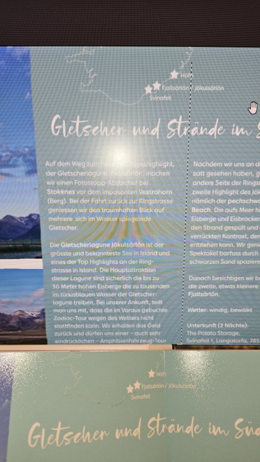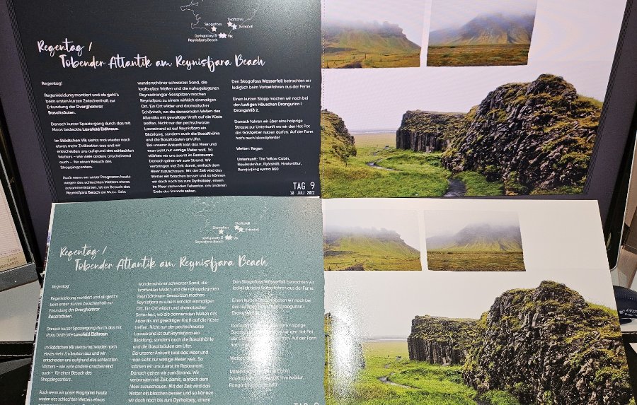 Ich kann gerne Fotos zur Illustration zustellen, vgl. unten. Vor einer allfälligen Neuaufgabe der Bestellung, wäre es wichtig, die Ursache für die falsche Farbdarstellung (vgl. oben a)) und die unschöne Darstellung der Islandkarte (vgl. oben b)) zu kennen. Damit ich dies entsprechend prüfen und gegebenenfalls anpassen kann. Betr. c) kann ich die Bilder noch mehr über den Seitenrand hinausziehen.