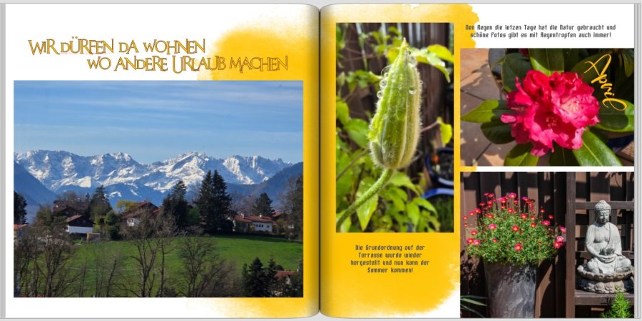 Für meinen April-Beitrag musste ich noch nicht mal ausm Haus gehen - wäre auch nicht möglich gewesen, denn ich saß an meinem Fotobuch. Auf der Terrasse aber musste zwischendurch der Frühjahrsputz gemacht werden und so ist auch eine Seite mit den ersten Frühjahrsblühern für das Jahrbuch entstanden. Wünsche allen weiterhin viel Freude an euren Objekten und Vorhaben für 2025 - Rosi