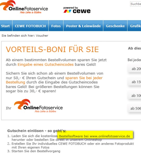 Das ist nicht ganz korrekt.Zumindest zur Einlösung der Vorteils-Boni ( .. und um die ging es hier ursprünglich) ist Schritt für Schritt genau vermerkt, wie die Gutscheincodes einzulösen sind. Da heißt es unter anderem, dass die Bestellsoftware bei http://www.onlinefotoservice herunterzuladen ist: