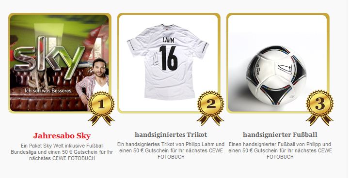 Mitmachen lohnt sich: Die 10 besten Fotos gewinnen, einen CEWE FOTOBUCH Gutschein im Wert von 50 €. Außerdem haben diese Fotos die Chance einen von den drei hochkarätigen Preisen zu erhalten. Als Hauptgewinn lockt ein Jahresabo SKY Welt plus Fußball Bundesliga. Der zweite Preis ist ein von Philipp Lahm handsigniertes Trikot und der Drittplatzierte erhält einen Fußball unterzeichnet von Philipp Lahm.