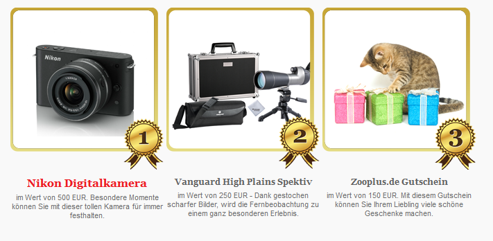 Mitmachen lohnt sich: Die besten Fotos haben die Chance einen von zehn hochkarätigen Preisen zu gewinnen. Als Hauptgewinn lockt eine Systemkamera von Nikon im Wert von 500 EUR. Der zweite Preis ist ein Spektiv der Marke Vanguard und der Gewinner des dritten Preises erhält einen Zooplus.de Gutschein im Wert von 150 EUR. Die Plätze 4-10 gewinnen jeweils einen CEWE FOTOBUCH Gutschein im Wert von 50 EUR.