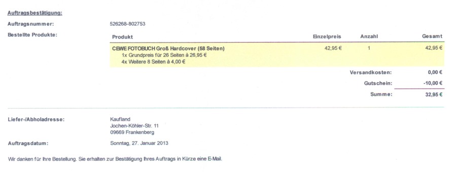 Wir laden Sie herzlich ein, die neue CEWE Community mit integriertem Forum zu entdecken und künftig zu nutzen. Das bisherige Forum, in dem Sie sich gerade befinden, steht nur noch bis Ende 2025 für neue Beiträge zur Verfügung und wird ab dem kommenden Jahr 2026 nur noch lesend zugänglich sein. Informieren und registrieren Sie sich jetzt in der neuen CEWE Community – wir freuen uns auf Sie! 5.0.1 - AuftragsbestätigungBetriebssystem: Windows