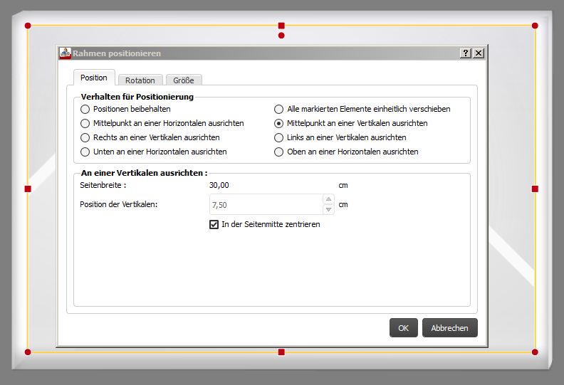 Dazu skalierst du den Platzhalter zuerst auf die richtige Größe, am besten über „Objekt (bzw. Rahmen) positionieren“: Platzhalter markieren, Alt+P drücken, „Größe“, dann „Absolute Größe einstellen“ anklicken. Hier gibst du die Höhe und Breite an, bei einem 5 cm breiten Rand ziehst du 2 x 5 cm in der Höhe und in der Breite ab, also z.B. 60 x 90 cm. Wenn dein Platzhalter noch an der originalen Stelle saß, richtet er sich wieder genau mittig aus. (Ansonsten musst du über „Objekt positionieren“ „Position“ „Mittelpunkt an einer Horizontalen/Vertikalen ausrichten“, dabei die Werte kontrollieren, die voreingestellten sind nicht immer logisch.) Nun fügst du ein Foto ein, skalierst es auf die gewünschte Größe und richtest es dann an dem Platzhalter aus: Platzhalter anklicken, mit gedrückter Strg-Taste Bild anklicken und an den passenden Kanten ausrichten, siehe Bild. (Möglicherweise hättest du die genaue Beschreibung der einzelnen Schritte nicht gebraucht, dann nützen sie vielleicht anderen.) liebe Grüße