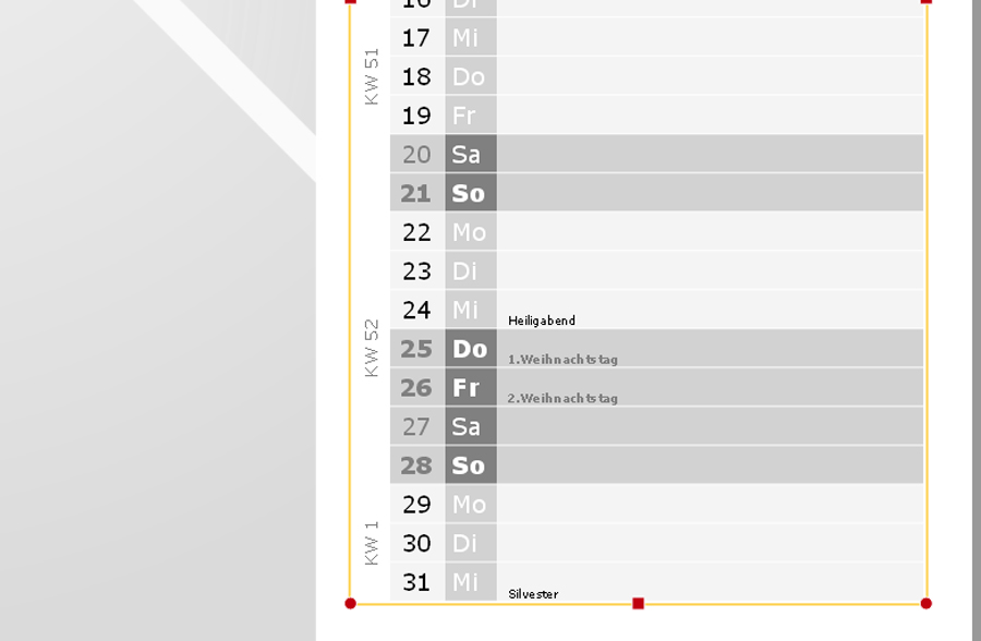Ich bin davon ausgegangen, dass Du den frei gestaltbaren Kalender meinst. Im Design links oben wird bei mir links ein Bild, rechts ein Kalendarium mit Zeilen angezeigt, jedoch nur mit mit Monatsdaten. In der zweiten Reihe finde ich das gleiche, jedoch mit Feiertagen, die sind aber in ziemlich kleiner Schrift und ohne Fehler - ich weiß natürlich jetzt nicht, ob wir das gleiche Design meinen. Kannst Du einen Screenshot einstellen von Deinem problematischen Kalender? Liebe Grüße