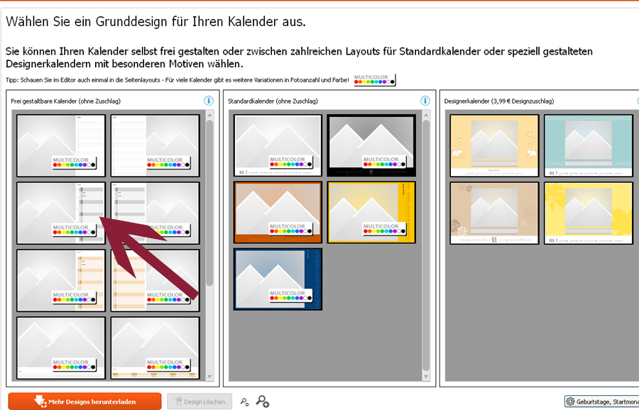 Re: Programmierfehler bei KalenderIch habe versucht, Dein Problem nachzustellen, konnte es leider nicht. Ich habe Wandkalender A3 Panorama aufgerufen. Es erscheinen 3 Möglichkeiten der Gestaltung (Frei gestaltbarer Kalender, Standardkalender, Designerkalender)