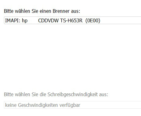 Wenn Sie diesen anwählen, sollten Sie anschließend auch die Brenngeschwindigkeit einstellen können. Sobald Sie also IMAPI : hp CDDVDW TS-H653R (0E00) auswählen sollte Ihre Anzeige in etwa so aussehen: