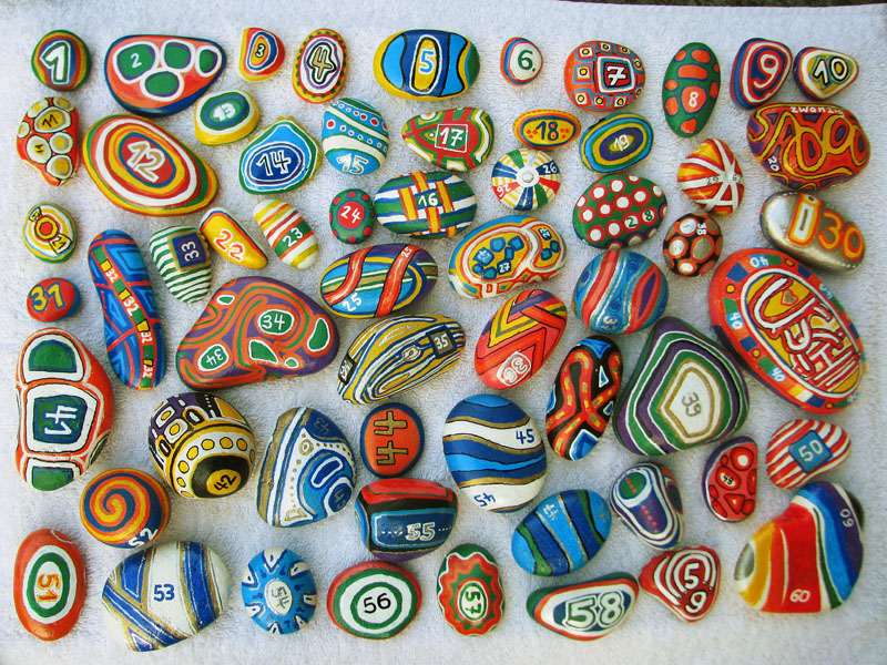 Re: Challenge 01/2014 • Farbenprachtuwu hat geschrieben: Das schönste und wertvollste Geburtstagsgeschenk, das ich je erhalten habe: Handbemalte Steine, für jedes Lebensjahr einer. Welcher Zeitaufwand und welche Fantasie stecken da drin!