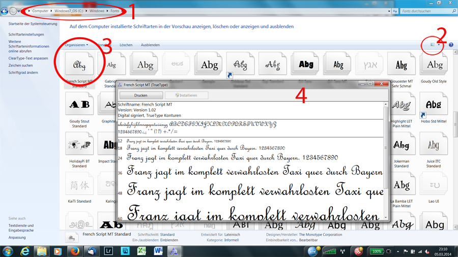 Re: Mit Schriftarten gestaltenSeit kurzem weiß ich, wie ich unter Windows7 rasch zu einer Vorschau der auf meinem Rechner installierten Schriftarten komme. Vielleicht hilft das auch noch jemand anderem: