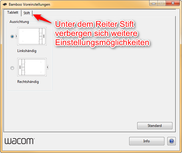 Wenn ich dann direkt auf Wacom Voreinstellungen klicke, öffnet sich ein Fenster, in dem zuerst zwischen links- und rechtshänder wechseln kann und unter einem weiteren Menüreiter finde ich dann weitere Einstellungen: