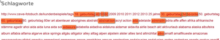 Hier ein weiterer Test:Von den 68 Schlagworten in den ersten 4 Zeilen der Webseite haben 13 Schlagworte (=19%) kein zugeordnetes Kundenbeispiel mehr. Re: keine Kundenbeispiele?Die Beschlagwortung ist schon eigenartig, beim neuesten New York Buch sind sie:
