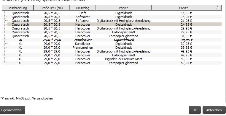 In der Eingangsfrage ist von XXL die Rede, was einer Größe von ca. 28x36 entspricht. Das kann nicht auf quadratisch geändert werden.Nein Fehlermeldung erhalte ich keine. Ich kann aber im XL Format (so habe ich das Projekt erstellt) nur die Qualität ändern aber nicht auf zbsp. 20x20 wechseln. Denke die SW verhält sich auf einem Mac etwas anders als auf einem Windows PC. Jetzt sprichst Du aber von XL = ca. 30x30 und das geht natürlich. Im Buch gehst Du auf Bertha Re: Grösse des Buchformates ändernBertha hat geschrieben: