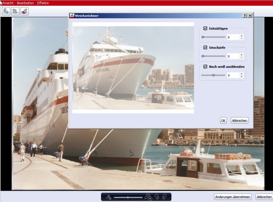 Fragen sind jederzeit willkommen. Niemand muss den Überblick behalten, wann und ob das schon mal Thema war :) In der Fotoschau (Start z.B. per Doppelklick auf das Bild) Effekte --> Weichzeichner .. --> Nach weiß ausblenden Wenn allerdings nicht das ganze Foto, sondern nur eine Seite des Bildes nach Weiß ausgeblendet werden soll, dann muss man das Foto mit einer Maske (früher Passepartout genannt) der Kategorie "Verlauf" versehen. Falls die gewünschte Verlaufsart nicht dabei ist, kann man mittels "Mehr .." weitere Effekte der Kategorie Verlauf aus dem Downloadportal nachladen. Re: Fotobuchsoftware 5.1.6Verlaufsmasken: vgl. auch: http://www.cewe-community.com/forum/vie ... 504#p81504