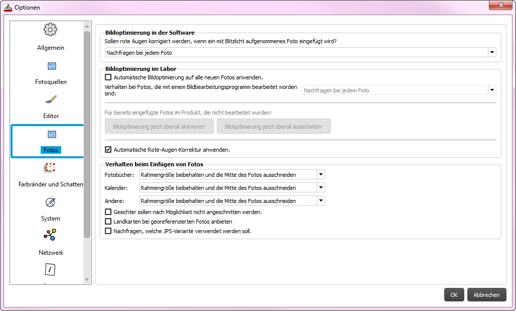 In den Optionen finden Sie grundsätzlich zwei unterschiedliche Einstellungen für die rote Augen Korrektur. Diese finden Sie im Bereich Fotos.