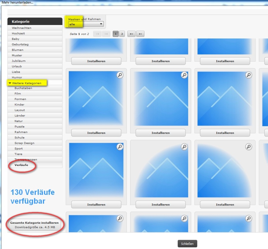 Versionsnummer: 6.0.1 oder auch 5.1.7 Beschreibung: Hallo zusammen. Ich versuche gerade mein 2. Fotobuch zu erstellen. Ich weiß aus vergangener Zeit (ne Weile her), dass es sehr viele verschiedene Verläufe gab. In den letzten Versionen finde ich aber nur noch VIER Verläufe. Es fehlt mir ganz besonders der "oben/unten" Verlauf. Wenn ich über den Butten "MEHR" Verläufe herunterladen möchte, werden mir überhaupt keine angezeigt. Sie sind einfach verschwunden. Kennt sich hier jemand aus und kann mir helfen? Das Buch soll ein Geschenk werden, aber die Zeit wird etwas knapp.... Ich danke Euch... Bine