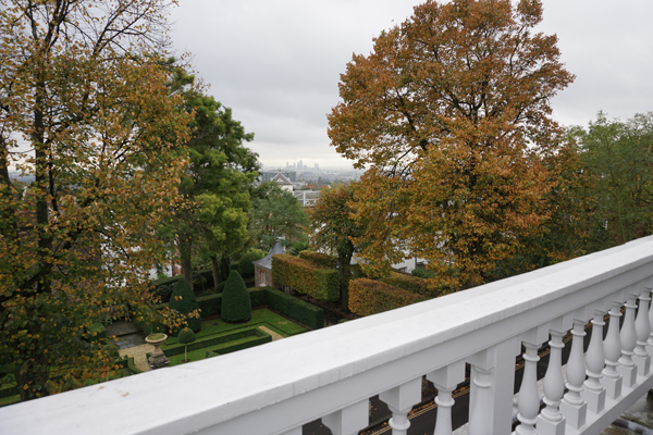 Fenton House (Hampstead Heath): Blick vom Balkon. Im Dunst sind noch gerade die Hochhäuser in der City of London zu erkennen.