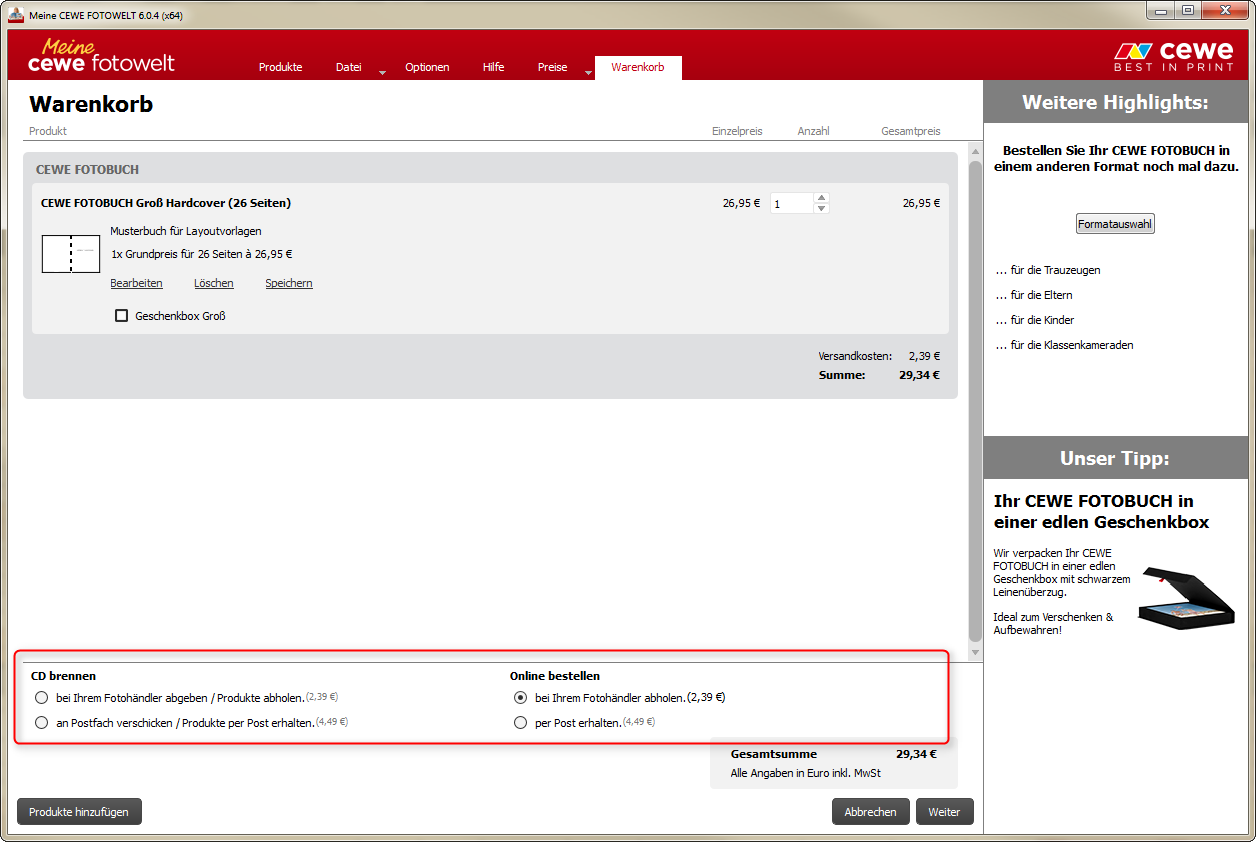 Per CD: Bei Handelspartner, die Filialen vor Ort haben, können Sie per CD bestellen. Hierfür wählen Sie in der Software die Option „Bestell CD brennen“ an. Während des Brennens der CD wird noch keine Bestellung ausgelöst. Erst wenn Sie die Auftragscd bei Ihrem Handelspartner abgeben, wird eine Bestellung gestartet. Nur mit dem Brennen einer Bestellcd sind also keine Kosten verbunden. Onlinebestellung: Sollten Sie keinen Handelspartner in Ihrer Umgebung haben, können Sie bei einigen unserer Handelspartner auch bequem von zu Hause bestellen über die Onlinebestellung. Im Gegenteil zu der Auftragscd wird Ihre Bestellung direkt nach der Onlineübertragung ausgelöst. Liebe Grüße
