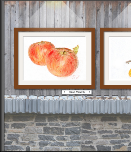 Pitty, ich hatte die gleiche Idee mit dem Bilderrahmen :) Ich wollte eine "Galerie" mit Zeichnungen haben, die wir so auch in der Wohnung aufgehängt haben. Sie haben die etwas tieferen Rahmen aus dem schwedischen Möbelhaus und ein Passepartout. Das habe ich versucht nachzubasteln. Mein "Bilderrahmen" besteht allerdings nur aus dem transparenten Bild mit Rahmen und Schatten. Der Schatten im Bild ist aus irgendeinem Grund kleiner als der außenrum, und das hat hier genau die richtige Wirkung. Meine Reihenfolge ist also: 1. cremefarbiges Clipart im Hintergrund, darüber 2. transparentes Bild mit Rahmen und Schatten (2mm, 50%, 10px, 6mm; ist wahrscheinlich abhängig von der Bildgröße ab), darüber 3. etwas kleineres Bild (Zeichnung) mit kleinerem Schatten Als Hintergrund habe ich die Außenwand unserer Scheune fotografiert. Bei mir sieht's so aus: liebe Grüße