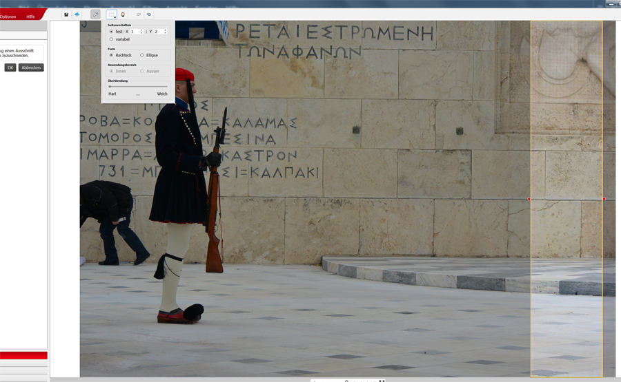 Bin zwar nicht grasmücke :lol: , aber nun:Wenn ich im Dialogfeld von Rechteck auf Ellipse umschalte, sehe ich sofort die Wirkung. Wenn ich im Dialogfeld das Seitenverhältnis ändere, sehe ich keine Wirkung. Aus meiner Sicht sollte sich der Rahmen schon entsprechend ändern, wenn ich Eingaben beim festen Seitenverhältnis mache. Das wäre auch hilfreich für alle, die nicht wissen, welche Seite mit x und mit y gemeint ist. Wenn das nicht geht, sollte der Rahmen spätestens dann, wenn ich ins Bild oder auf den Rahmen klicke, in das eingestellte Seitenverhältnis springen. Und ich würde erst jetzt, wenn ich die richtige Form sehe, die Größe und den Ausschnitt anpassen also den Rahmen schieben oder dran ziehen. liebe Grüße