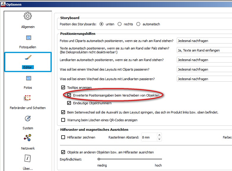 alles funktioniert wie beim Gestalten eines Fotobuchs: Mittels Kontextmenü oder direkt über Alt+P kann die absolute Größe des Objektes bestimmt werden. Bei der Positionierung hilft das Einschalten eines Rasters mit selbst vorgegebenem Rasterabstand oder die Beobachtung der Positionsanzeige beim Verschieben des Objektes: Re: Exakte Positionierung und Größe von BildernSabi222 hat geschrieben: finde ich die Funktion nicht, oder ist es tatsächlich nicht möglich, ein Objekt exakt durch die Eingabe von Koordinaten (z.B. linke obere Ecke x=5mm, y=7mm) zu positionieren?