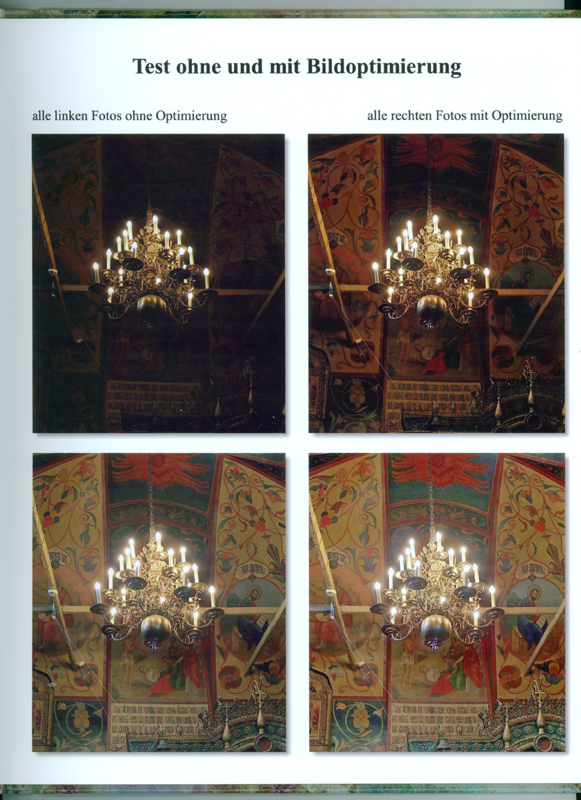 Mein Fazit: die Bildoptimierung greift sehr sanft ein (gut so), zu meinen selbst bearbeiteten Fotos gibt es manchmal eine minimale Verbesserung, bei den alten Fotos, die ich heftig bearbeiten musste, manchmal eine leichte Verschlechterung. Ich werde also bei meiner Arbeitsweise bleiben. Mein Monitor zeigt mir das Ergebnis ziemlich genau so an, wie es hinterher im Buch aussieht. Da ich bei meinem Musterbuch Fotopapier glänzend gewählt hatte (mein erster Versuch mit diesem Papier), war Abfotografieren wegen des Glanzes nicht möglich, also habe ich gescannt, so gut es ging. Die Fotos sind so angeordnet, dass immer oben links das Original, unten links meine bearbeitete Version und auf der rechten Seite jeweils das gleiche Foto mit Optimierung zu sehen ist. Man kann aber alle Skeptiker beruhigen - die Optimierung wird vieles sanft verbessern, man kann aber keine Wunder erwarten. Farbstiche entfernt sie, zumindest in meinen Versuchen, nicht. Liebe Grüße