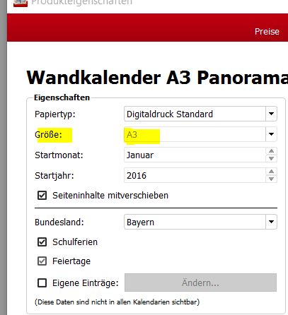 Nein, ich habe einen Kreativkalender gewählt, Panorama A4, Digitaldruck und wollte den zwischendrin auf A3 ändern. Inzw. habe ich den Kalender neu unter A 3 gestaltet.