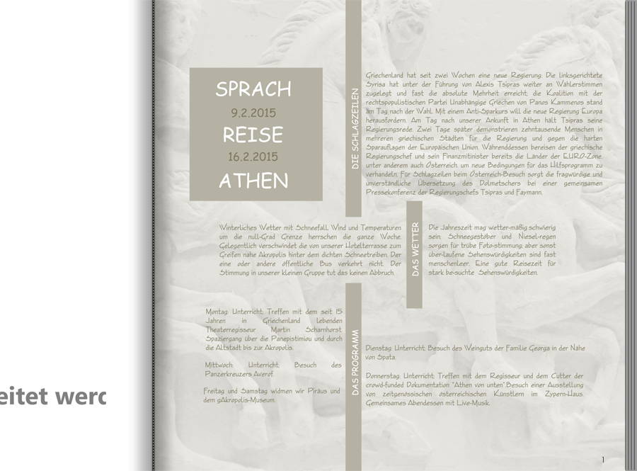 Wenn ich größere Textmengen unterbringen will, mache ich das auch meistens mit mehrspaltigem Text in Blocksatz. Gelegentlich mache ich Versuche "aus den Spalten auszubrechen". Ich nehme Pittys Aufforderung gerne wahr und stelle drei von diesen "Ausbruchsversuchen" hier zur Diskussion.Gestaltungsbeispiele oder Schreckensgebilde mit den Schriftarten: