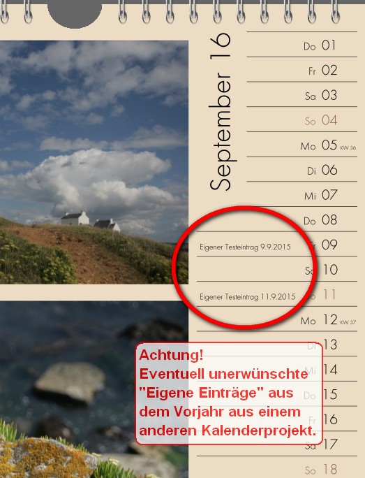 Auch kann es passieren, dass Einträge, die man vor einem Jahr mal festgelegt hat, unbemerkt im neuen Kalender verwendet werden. Das gilt umso mehr, wenn ein alter Kalender als Vorlage verwendet wird.