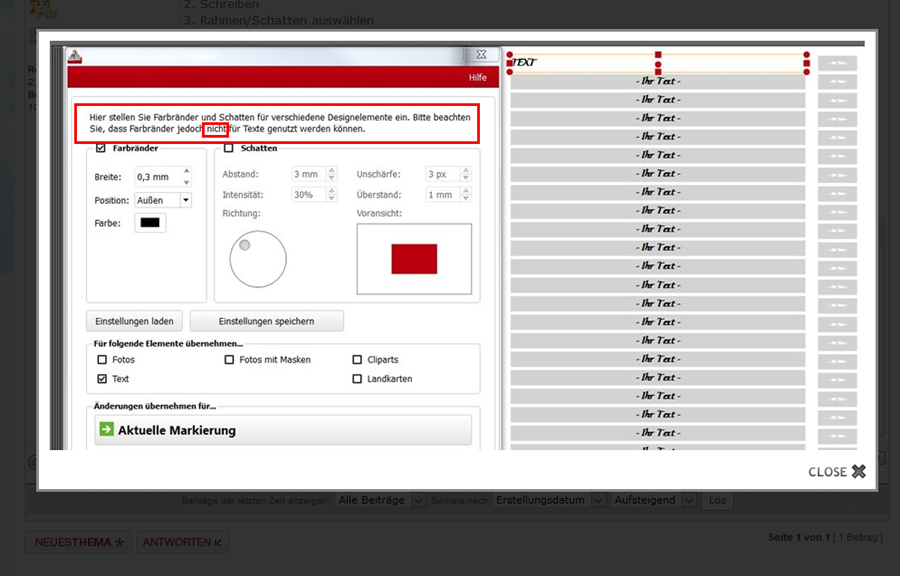 soeben hab ich ein komisches Phänomen erlebt. Ich möchte Textstreifen mit Rahmen versehen.Das soll während der FB-Gestaltung eigentlich nur zur erleichterten Orientierung/Positionierung des Inhaltsverzeichnisses dienen. Am Ende sollen die Textränder wieder verschwinden. Leider wird um den Text kein Rahmen erzeugt. Vorgehen: 1. Textfeld erzeugen 2. Schreiben 3. Rahmen/Schatten auswählen 4. Rahmengröße und -farbe festlegen 5. Markierung auf "Text" festlegen 6. Für aktuelle Markierung übernehmen (gern auch für die gesamte Seite) --> Nix passiert, das Textfeld bleibt rahmenlos Was mach ich falsch? LG Blicki Win 7 CEWE Fotowelt 6.1.3