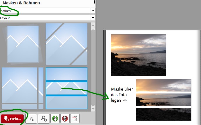 da gibt es mehrere Möglichkeiten. Entweder, Du fügst die Rahmen nebeneinander und richtest die Bildausschnitte manuell aus (So wie von Silber-Distel beschrieben), oder Du verwendest eine der vorgegebenen Masken. Die Maske gibt es leider nur für 3-teiler und nur waagrecht. Für senkrecht muss man etwas "tricksen". Siehe Screenshots. Gruß DSL-schnell