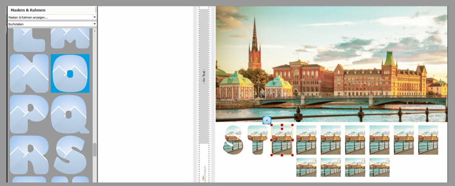 Tipp: Es ist wichtig, dass Sie zunächst die Bildfelder gleichgroß anlegen, diese befüllen und dann erst die Buchstabenmasken anwenden. Andernfalls kann es zu unerwünschten Größenunterschieden der Buchstaben kommen.