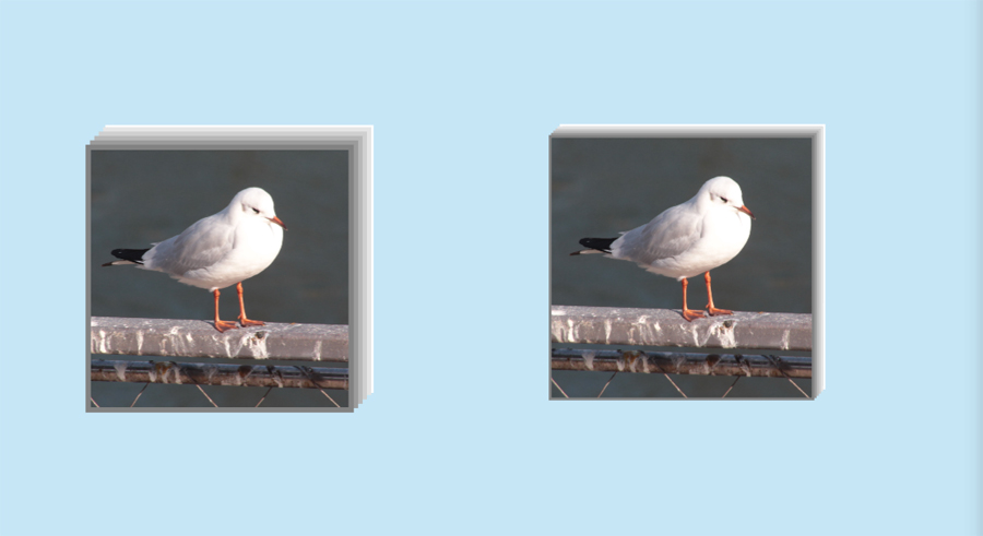 Im linken Beispiel habe ich einen 0,8 mm dicken Rahmen gemacht und die Fotos jeweils um 2 Tasterücker versetzt. Mit Rahmen gleicher Farbe geht es natürlich auch; da reichen mir oft schon 3 Überlagerungen. Unbedingt auf einer linken Seite im Fotobuch machen und bei Bedarf das ganze dann auf die rechte Seite schieben.