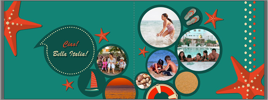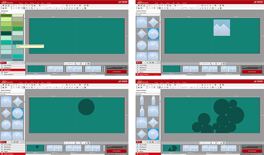 Zunächst haben wir auf die Doppelseiten den Hintergrund #6072 aus der Kategorie „Farben“ eingefügt. Dann wurden die runden Hintergründe für die Fotos und Cliparts erstellt.