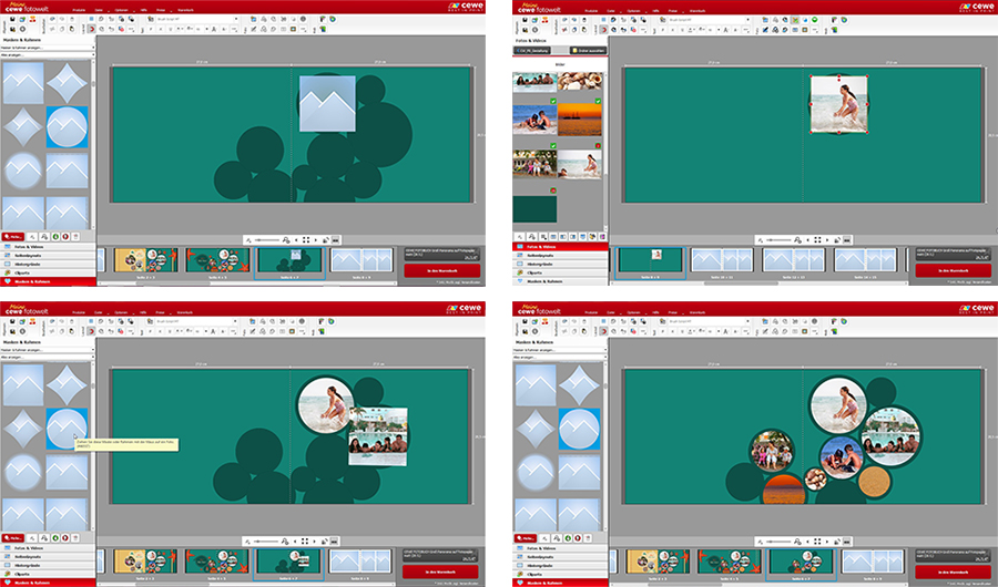 Dafür platzieren Sie wie gewohnt das einfarbige Bild auf die entsprechende Stelle Ihres CEWE FOTOBUCHS und wenden die Kreismaske #46537 aus der Kategorie „Formen“ darauf an. Nun können Sie den Kreis mit Hilfe von „Kopieren“ und „Einfügen“ vervielfältigen und durch das Ziehen am Bildrand die Größe der einzelnen Kreise variieren. Fügen Sie für jedes Foto, welches Sie in Ihrer Gestaltung verwenden möchten, einen Kreis ein. Achten Sie beim Platzieren der Flächen darauf, dass sie sich leicht überschneiden.