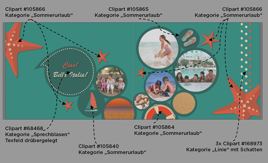 Für die weitere Gestaltung haben wir zahlreiche Cliparts aus den Kategorien „Linie“, „Sommerurlaub“ und „Sprechblasen“ verwendet. Dabei haben wir darauf geachtet, dass die Cliparts möglichst rund sind und somit die Gestaltungsidee unterstützen.