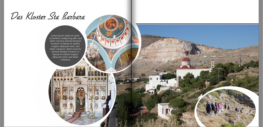 Deine beiden Seiten wirken schon sehr gut. Bei dem 1.Bild (mit dem Kloster) würde ich das leicht ovale Bild rechts unten in der Ecke den weißen HG nach außen schmaler machen. Ich persönlich finde ihn so zu breit für das Gesamtbild.