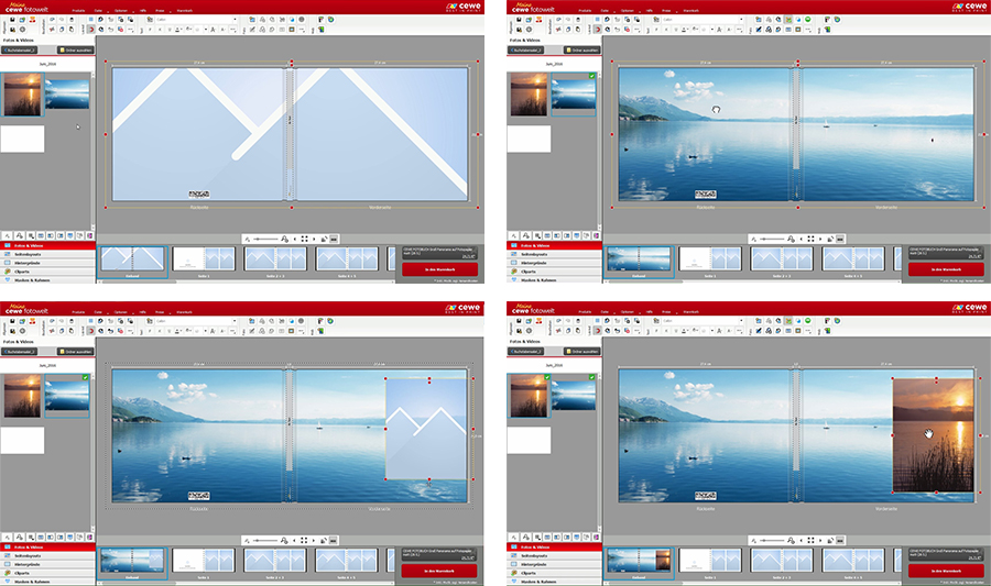 Zunächst fügen Sie einen Platzhalter ein. Diesen ziehen Sie über die Vorder- und Rückseite des Covers und befüllen ihn mit dem ersten Foto. Dann legen Sie einen zweiten Platzhalter an. Dieser positionieren Sie auf der Vorderseite und ziehen in diesen das zweite Bild.