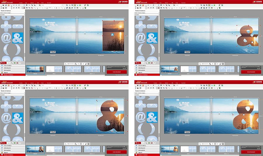 Nun gehen Sie in der linken Auswahlleiste auf „Masken & Rahmen“ und wählen oben die Kategorie „Buchstaben“ aus. Dort finden Sie das &-Zeichen. Diese Maske ziehen Sie auf das zweite Bild. Daraufhin nimmt Ihr Foto die Form des Symbols ein. Falls die Größe des &-Zeichens Ihrer Vorstellung nicht entspricht, können Sie diese durch Ziehen am Bildrand verändern.
