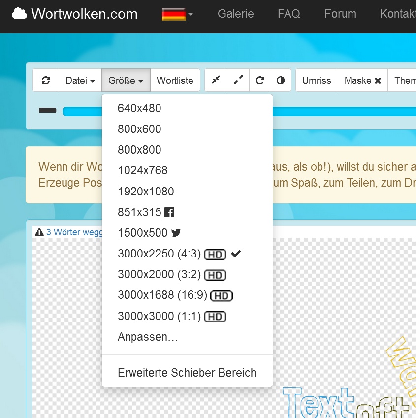I also played around and found out, that you can choose the size of your wordcloud and also the file-type. An you can set a transparent background. liebe Grüße