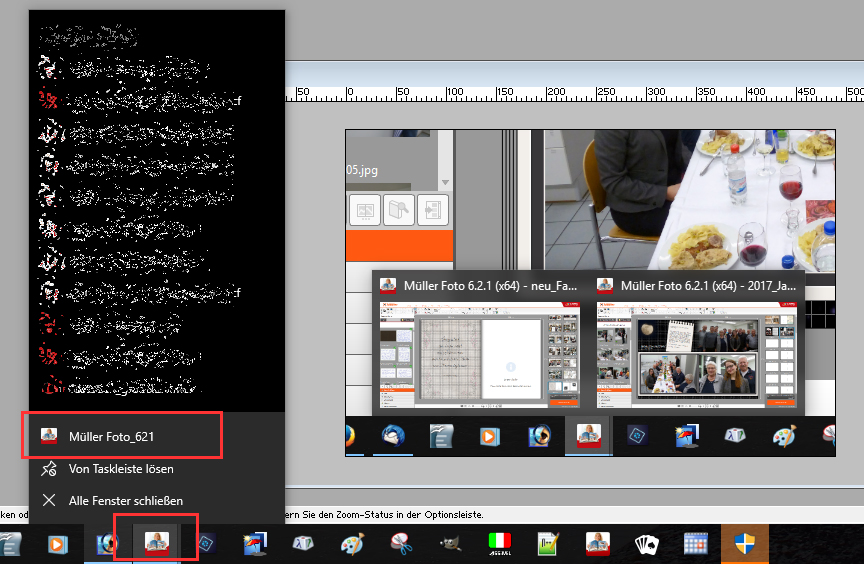 Hier mein Beispiel: ich habe die CEWE-Kachel in meiner Taskleiste. Diese klicke ich mit der rechten Maustaste an, dann öffnet sich das Programm. Über "Datei" wähle ich das entsprechende Buch aus. Das kann ich beliebig wiederholen. Du siehst jetzt zwei meiner geöffneten Bücher - ich kann ganz nach Bedarf von Buch zu Buch wechseln, bearbeiten und speichern. Viel Erfolg! Liebe Grüße