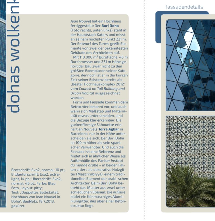 Ich habe diese Gestaltungsaufgabe zum Anlass genommen, Euch eine mir bis dato unbekannte Brotschrift vorzustellen. Da nicht nur Reisen in historische Altstädte, sondern auch in moderne Down-Towns gemacht werden, habe ich unseren Zwischenstopp in Doha, Katar, als Beispiel ausgewählt. Dort gibt es massenweise Hochhäuser „mitten in der Wüste“, deren Architektur relativ verspielte Formen und orientalische Details hat. Mein Gestaltungsansatz spielt mit diesen Faktoren. Layout: hochformatiges Buch (wie die Häuser) Fotos: hochkant, sehr schmal Farben: Blau wie der knall-blaue Himmel; Sand wie der Sand Gimmicks: clipart und Fotos mit ganz leicht gerundeten Ecken (etwas verspielt wie die Architekturdetails) Font: modern, ohne Serifen, leicht verspielt (wie die Architektur) Eine schlanke hohe Schriftart wäre auch gut gewesen. Diese sind bei längeren Texten in der Regel aber nicht so gut lesbar. light, 14 pt.; Überschrift: Exo2, normal, 46 pt., Farbe: Blau Foto, Layout: pitty; Text: „Doppeltes Selbstzitat, Hochhaus von Jean Nouvel in Doha“, BauNetz, 18.7.2013, gekürzt. Lieber Gruß, pitty