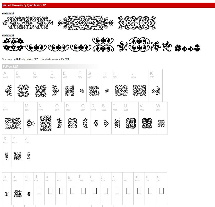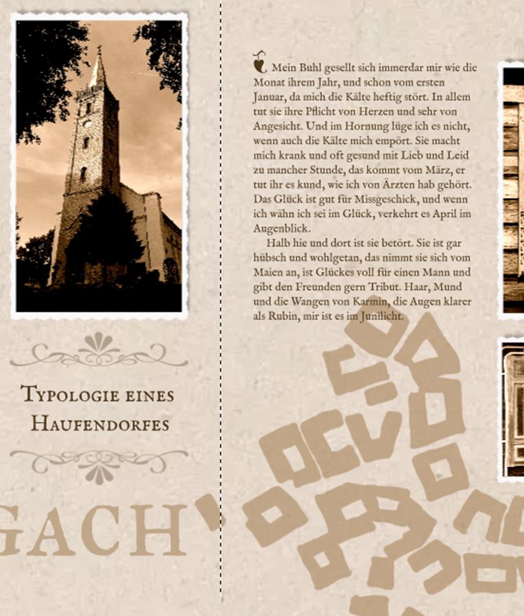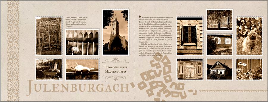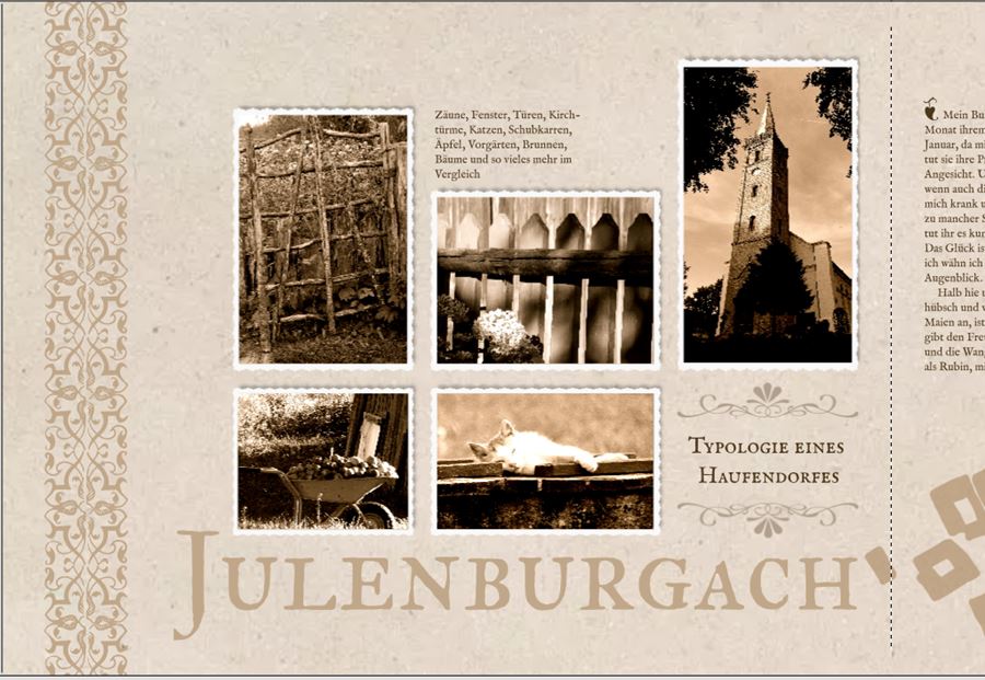 Der Font Im Fell ist ein Revival der Schrift, die Bischoff John Fell im 17. Jahrhundert geschnitten hat. Igino Marini hat sie in mehreren Formen für den digitalen Gebrauch nachgeschnitten. The Fell Types are digitally reproduced by Igino Marini. www.iginomarini.com. Hier könnt Ihr ttf- und otf-Versionen inkl. der Flower-Versionen herunterladen. Auf google-font sind einige Schnitte erhältlich. Der Font eignet sich m.E. hervorragend für jedwede Chroniken, aber auch biblische, religiöse Motive. Eine Mischung mit anderen Fonts kann ich nicht empfehlen. Ich habe ein Haufendorf erfunden und ein Layout für eine Chronik erstellt: Fleuron als „Initial“: Aldus-Blatt, Im Fell Flowers 2, 12 pt. Überschrift: Im Fell Great Primer SC, 97 pt. Zwischenüberschrift: Im Fell English SC, 20 pt. Arabeske, Banderole links: Im Fell Flowers 1, 50 pt. Fleuron-Linie, rechts unten: Im Fell Flowers 2, 30 pt. Ornament bei der Zwischenüberschrift: cewe-clipart Schwarzplan Melk, nachgezeichnet Fotos: pitty, Sepia-Bearbeitung mit cewe-Software Fotorahmen: cewe-Rahmen Hintergrund: cewe-Angebot, mit transparenter weißer clipart-Fläche aufgehellt Text: „Mein Buhl“, Dorf: Fantasie Layout: pitty Lieber Gruß, pitty