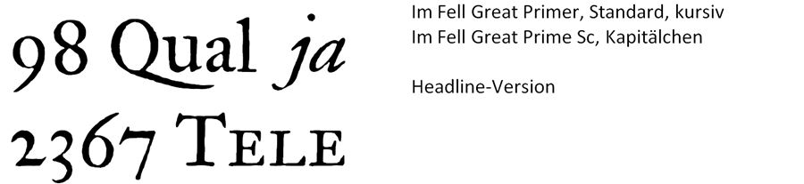 Liebe Gletscherfrau,Dein Buch gefällt mir sehr, sehr gut. Magst Du hier einen größeren Ausschnitt eines Textblockes mit Im Fell zeigen? Da es verschiedene Versionen der Im Fell gibt (Pica DW, Double Pica, English, Great Primer, French Canon und die jeweiligen Kapitälchen), wäre es spannend (zumindest für mich Ich bin auch neugierig, welche anderen Schriften Du für längere Texte verwendest. Magst Du hier nicht auch etwas posten? Das hilft bestimmt auch anderen Forenteilnehmern. Denn die Suche nach passenden und gut lesbaren Schriften ist ja, wie Du selbst erfahren hast, langwierig. Lieber Gruß, pitty