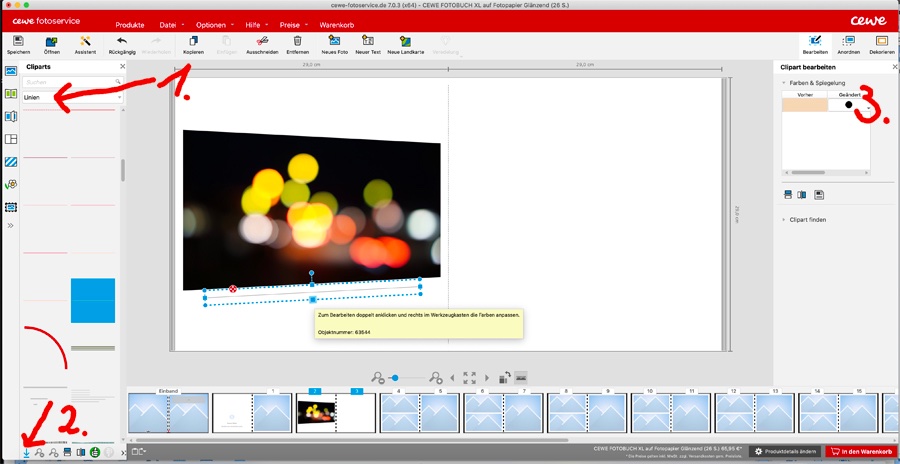 Hoffentlich kann ich dir bezüglich. deiner Frage helfen. Hänge dir einen Screenshots an, so ist es für dich einfacher, den Weg nachzuvollziehen. Du kannst verschiedene Linien, bz. Strichstärken wählen. Gehe unter Chliparts und Linien (1). Falls du dort nicht fündig werden solltest, kannst du dir unter dem Download-Pfeil (2) weitere Linien/Striche runterladen. Auf der rechten Seite (3) kannst du die gewünschte Farbe aussuchen. Bei meinem Beispiel habe ich Linie Nr. 63544 gewählt. Dies ist ein sehr dünner Strich, meiner Meinung nach fast zu dünn. Falls du nicht klar kommst, melde dich gerne wieder Re: Collage mit schrägen Fotoshm, einerseits danke das mir jemand geantwortete hat, andererseits denke ich ich blöd von mir das ich überhaupt gefragt habe,