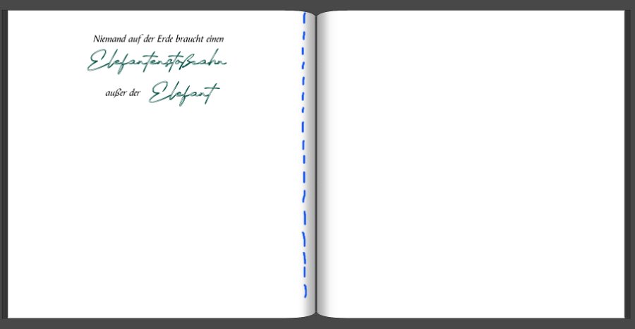 @Pascalinah: Das mit dem Schatten ist eine gute Idee, auch wenn das nicht 100%ig der Bereich ist, eine sehr gute Annäherung ist es auf jeden Fall. @Oldnat: An Layflat habe auch schon gedacht, aber ich mag die dicken Seiten nicht so, und meistens würden mir die Seiten gar nicht reichen. Und außerdem mag ich Bücher lieber, die wie richtige Bücher aussehen Viele Grüsse