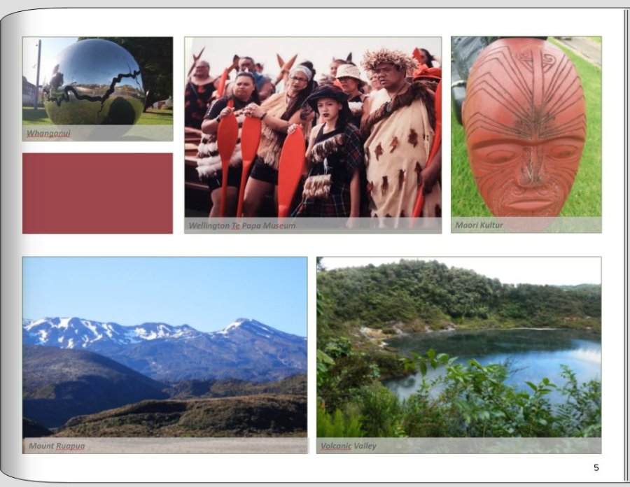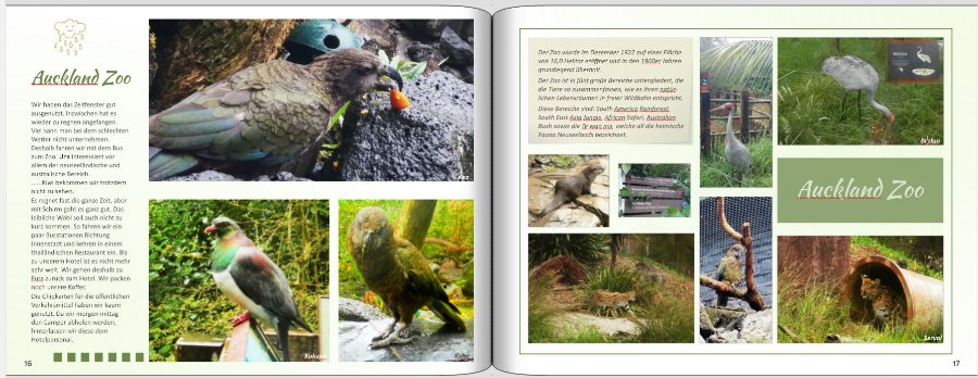 danke mit dem Vorschlag mit der Transparenz. Ich habe jetzt etwas herum gebastelt. (habe gerade gesehen, dass ich bei der Anordnung der Texte noch etwas ruckerl muss) So hundert prozentig gefällt es mir bei der Nordinsel noch nicht. Werde es beim Auckland Zoo aber trotzdem auch probieren. Hab jetzt mal den Text unter das Foto gesetzt mit transparenz über die gesamte Breite. Die Fotos kann ich dann immer noch tauschen. Was meint ihr? Liebe Grüße Asiafan