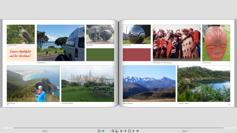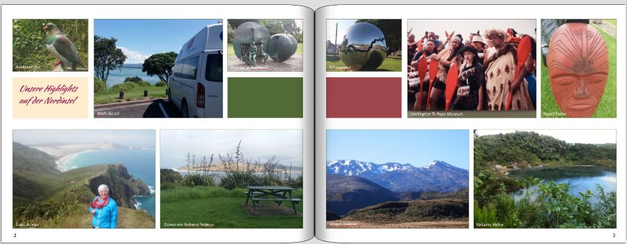 ich bin gerade dabei einige Seiten für die Nordinsel von Neuseeland zu erstellen. bitte nicht beachten: Die Texte muss ich noch überarbeiten. und die Seitenzahlen werden vor der Bestellung gelöscht. Ich hoffe mal, dass man die Namen auf den Screenshots einigermaßen gut sehen kann. Die Fotos der Hightlights möchte ich beschriften. Ich habe die Namen zuerst unterhalb der Fotos angeordnet, was mir aber nicht so gut gefällt. Normalerweise vermeide ich es Orte oder Namen in ein Foto zu schreiben. Ich hatte auch schon mal die Orte in die farbigen Kästchen geschrieben. Hier stört mich aber, dass die Fotos nicht genau den Verlauf unserer Reise angeben. Welche Meinung habt ihr? Liebe Grüße Asiafan