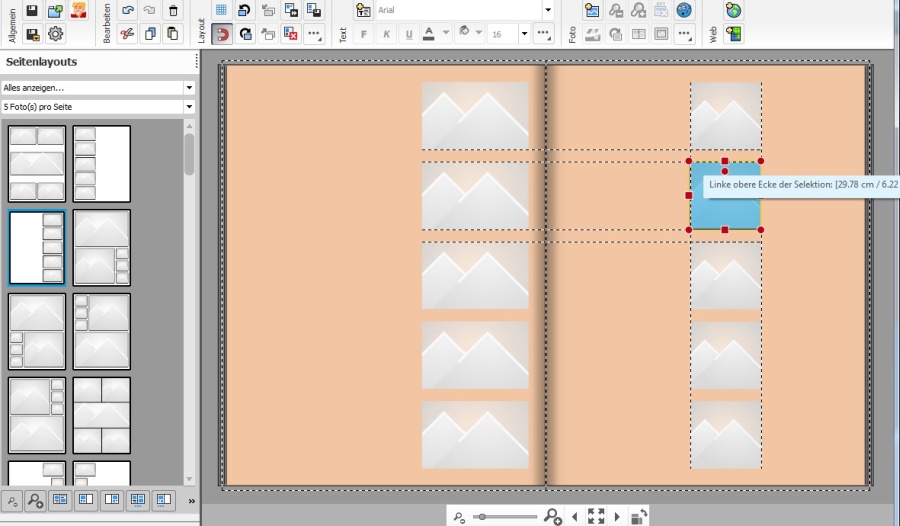 ich habe verstanden, dass 5 Bilder übereinander gestapelt werden sollen, wobei automatisch gleiche Zwischenräume und Seitenabstände oben und unten erzeugt werden sollen. Dazu empfiehlt es sich tatsächlich, eine Layoutvorlage auszuwählen (5 Bilder pro Seite). Dann sind die Abstände schon mal richtig. Die horizontale Form der Bildboxen kann nachträglich noch bequem mit der Maus und den magnetischen Hilfslinien angepasst werden. Im folgenden Beispiel habe ich das links in der Auswahl markierte Seitenlayout verwendet. Diese Bilder habe ich dann sogar noch mal auf die rechte Seite kopiert, um zu zeigen, dass man bequem auch die Boxbreite nach Bedarf anpassen kann. Re: Fotos untereinander ausrichtenDanke für die Tips, besonders der von Okular. Ist ja eigentlich ganz einfach. Ich bin nur nicht darauf gekommen, weil mir die Idee zur Anordnung erst im Lauf der Arbeit kam, manchmal sieht man den Wald ....