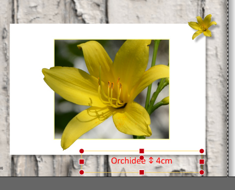 Du erstellst dort ein Textfeld mit allen deinen Angaben und Symbolen, klickst den Rand des Textfeldes an, kopierst es und fügst es ins Fotobuch ein. Dabei wird automatisch eine (transparente) png-Datei erstellt. Die Schriftgröße bzw. das ganze Textfeld sollte dabei erheblich größer sein als im Fotobuch, denn nach unten skalieren ist sehr einfach, hoch skalieren gibt dagegen ein unsauberes Bild. Beipiel (ich weiß, ist keine Orchidee :lol: ) liebe Grüße