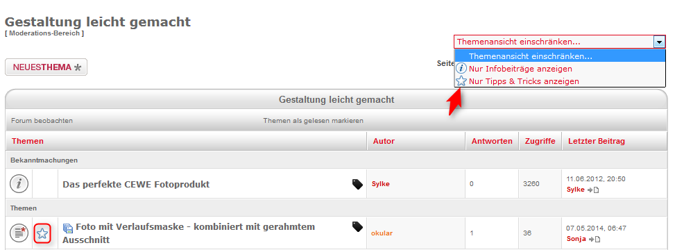 Damit solche guten Beiträge nicht vertreut sind, haben Sylke und ich die Möglichkeit Beiträge zu markieren. Wenn Sie in die Übersicht dieses Forenbereiches gehen, finden Sie nun vor Okularsbeitrag ein Sternchen. In dem Dropdownmenü rechts oben können Sie sich diese Sternchenbeiträge dann gefiltert anzeigen lassen :) Liebe Grüße