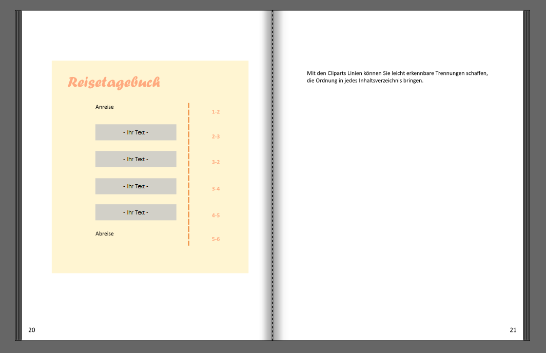 Neben schlichten Inhaltsverzeichnissen finden Sie in der Mustervorlage auch einige, in denen Cliparts als Akzente eingesetzt wurden.